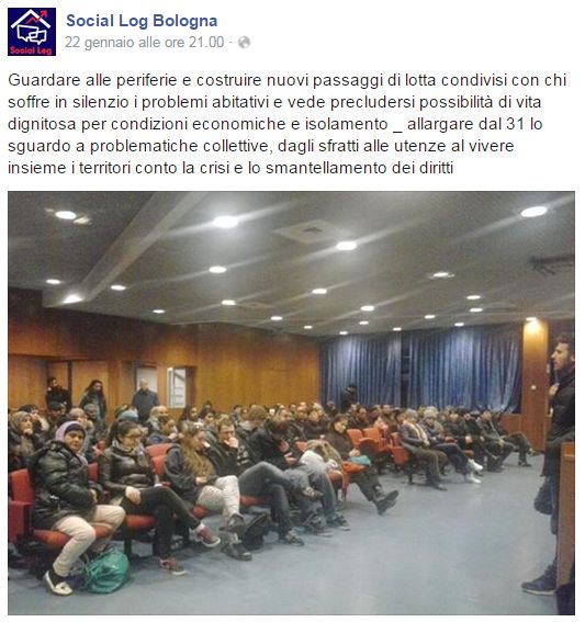 L’iniziativa è stata annunciata oggi durante un presidio davanti al Tribunale di Bologna dove, come ogni lunedì, si tengono le udienze relative agli sfratti. “Stando ai dati provvisori del ministero- spiega Luca di Social Log- a Bologna nel 2014 ci sono stati oltre 2.000 sfratti, per un totale di sei sfratti al giorno. E per il 2015 le previsioni danno gli sfratti in aumento”. A preoccupare molto il collettivo, poi, è anche un’altra cosa: “Dal Milleproroghe è stato tolto il ”blocca-sfratti”, che permetteva di far fronte ai casi più gravi accedendo a un apposito fondo. Ora che non c’è più, a Bologna ci sono dalle 120 alle 150 famiglie che non potranno rientrare nel fondo”.