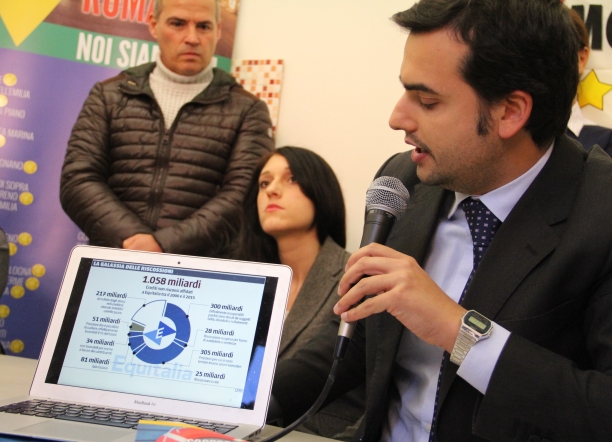 “Ce l’abbiamo con Equitalia? Noi ce l’abbiamo con le ingiustizie in generale, con chi chiede soldi alle persone senza averne diritto. Equitalia lo fa e lo fa in maniera sistematica, ma Equitalia non è altro che l’Agenzia delle entrate e l’Inps: dobbiamo rivedere la questione della riscossione”, dice invece il deputato e membro del direttorio grillino Carlo Sibilia, per poi presentare una serie di slide dell’operato della società di riscossione. Intanto, “nei Comuni dove riusciamo a operare abbiamo eliminato Equitalia internalizzando la riscossione delle imposte locali: così togliamo more, interessi e aggi, misure incostituzionali che vessano fino alla morte, fino al suicidio di tante persone che poi non hanno effettivamente questi debiti. È una battaglia di primaria importanza”, scandisce Sibilia al taglio del nastro.