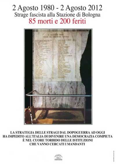 3 lug. – E’ una frase forte quella che accompagna quest’anno la nuova edizione del manifesto in occasione del 32esimo anniversario della “strage fascista alla stazione” del 2 agosto 1980. “La strategia delle stragi dal dopoguerra ad oggi ha impedito all’Italia di divenire una democrazia compiuta. E’ nel cuore torbido delle istituzioni che vanno cercati i mandanti” è la frase scelta dall’Associazione familiari delle vittime per accompagnare l’immagine della lapide con i nomi delle 85 vittime.