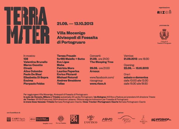 23 set. – Ha inaugurato lo scorso sabato e sarà visitabile fino al 13 ottobre Terramater, una collettiva di artisti contemporanei (tra i tanti, 108, Dem, Enzima, Tellas) che si propone di indagare il legame con la terra (intesa sia come oggetto che come concetto). Organizzata dal collettivo Rizoo (che già nel 2011 aveva organizzato Acquamater, incentrata sul rapporto con l’acqua) e promossa dal Comune di Fossalta di Portogruaro (VE), è allestita alla Villa Mocenigo di Alvisopoli, la mostra espone le opere di 19 artisti che vanno dalla pittura al video passando per la fotografia e l’installazione.