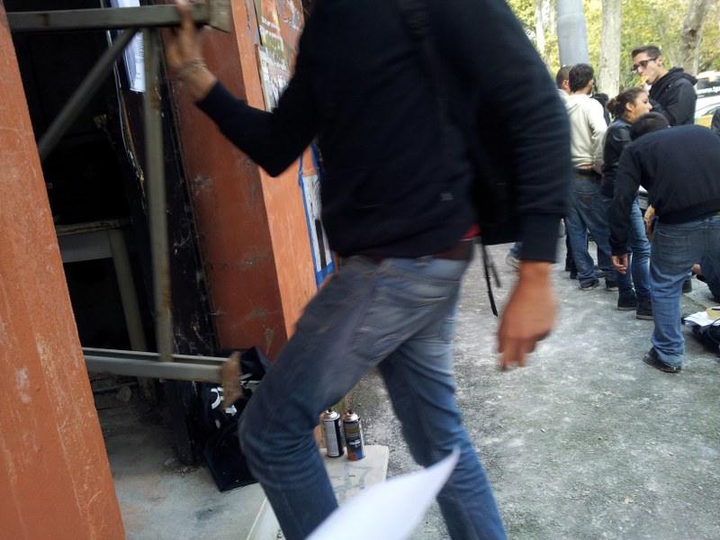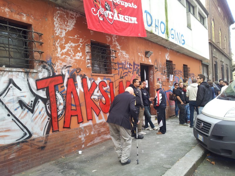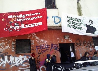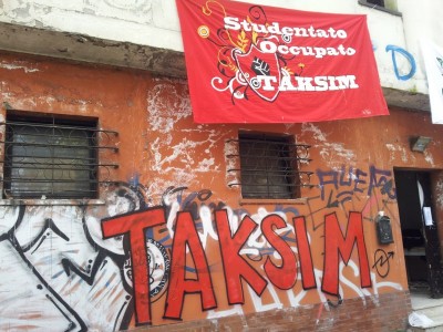 “Taksim is back in town”, si legge in uno striscione bianco appeso sopra la porta d’ingresso. Accanto alla scritta l’immagine di Pavlos Fyssas, rapper greco ucciso da estremisti di Alba dorata.