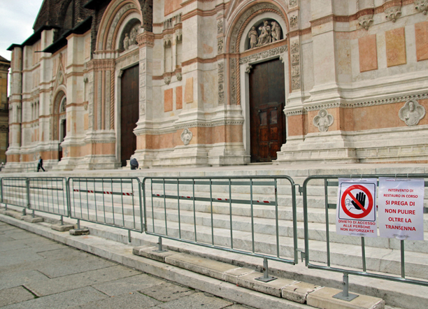 Bologna, 25 set. – La basilica di San Petronio è tornata al suo splendore, il restauro è finito, i ponteggi smontati, ma le transenne intorno alle scalinate restano. Sono state montate nel 2006, quando il Ministero dell’interno lanciò l’allarme terrorismo definendo la basilica bolognese un obiettivo sensibile. Dopo 8 anni sono ancora lì, impedendo a bolognesi e turisti di sedersi sulle scalinate.