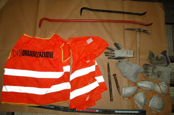 L’esito delle perquisizioni, effettuate dalla Digos, è stato positivo. E’ stata sequestrata anche una ricetrasmittente della stessa marca di quella trovata nelle vicinanze di CasaPound anche se non è ancora chiaro se è l’altra della coppia. Tra il materiale sequestrato ci sarebbero piedi di porco, mazze, giubbotti e casacchine a sigla ‘No Tav’, bandiere, bombolette spray e vernice. In uno zaino, all’interno dell’auto di un venticinquenne, c’erano poi alcuni ganci tagliati, di quelli utilizzati per il sabotaggio delle linee ferroviare: un episodio del genere avvenne nel bolognese sulla linea AV verso Milano, nel 2012. Gli investigatori pensano che fosse imminente un’azione di sabotaggio ferroviario.