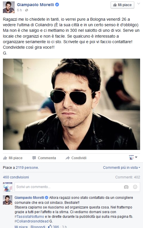 Bologna 18 feb.- Centinaia di commenti e una proposta che sembra essere stata raccolta al volo dall’amministrazione comunale. La visione collettiva, a Bologna assieme al protagonista, dell’ultima puntata dell’ispettore Coliandro che andrà in onda su Rai2 il prossimo 26 febbraio sembra essere a portata di mano. Giampaolo Morelli ha scritto sul suo profilo Facebook di essere stato contattato “da un consigliere comunale che era col sindaco, stasera capiamo se riusciamo ad organizzare questa cosa”.