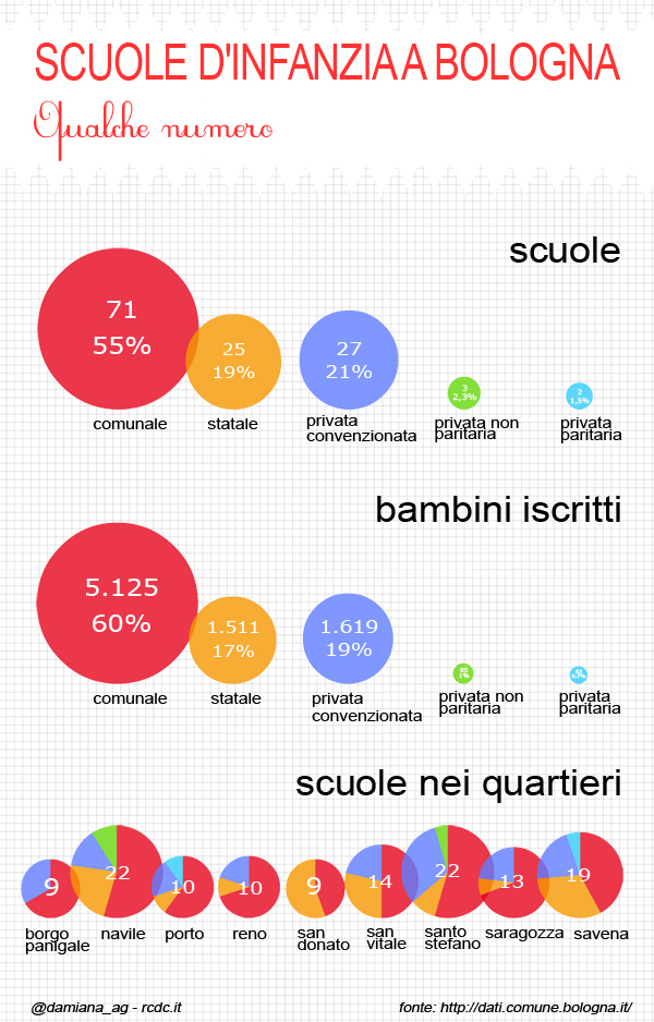 Suona la campanella per i bimbi tra i 3 e i 6 anni e noi ne approfittiamo per fare un po’ di chiarezza sulle scuole d’infanzia di Bologna. Guarda la nostra infografica. Quante sono le scuole pubbliche, rispetto a quelle private? In quali quartieri? Quanti bambini vi sono iscritti?