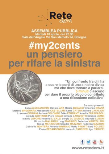 Bologna, 7 apr. – Si chiama “#My2cents – Un pensiero per rifare la sinistra” l’assemblea che l’ex deputato del Partito