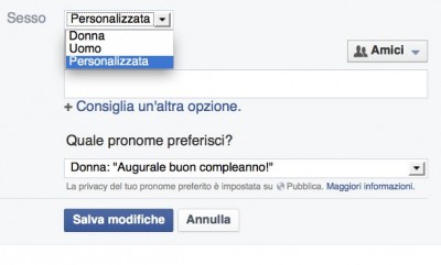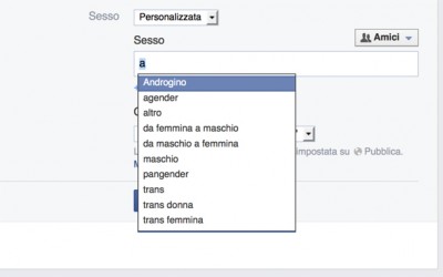 Bologna, 4 lug. – Se la dicotomia “uomo – donna” ti sta un po’ stretta su Facebook potrai d’ora in poi personalizzare il tuo genere di appartenenza, anche in Italia. “È un’innovazione importante – commenta Flavio Romani, presidente di Arcigay – che permette a tante persone che non si riconoscevano nell’aut aut del maschile e del femminile di sentirsi incluse nel più grande social network mondiale. L’iniziativa ci dà l’occasione di riportare la questione dell’identità di genere nell’ambito delle scelte individuali ed autodeterminate, sgretolando quel binarismo uomo/donna che in molti casi è un vero e proprio muro che esclude chi, rispetto alla propria identità, non si adegua a quel modello. Non solo: scorrere una lista che comprende termini come cisgender o transgender vuol dire fare cultura, iniettare conoscenza in un ambito nel quale l’Italia fa ancora fatica ad aprire un dibattito serio.” Il riferimento è ai suggerimenti di compilazione che appaiono iniziando a compilare il campo “personalizza”.