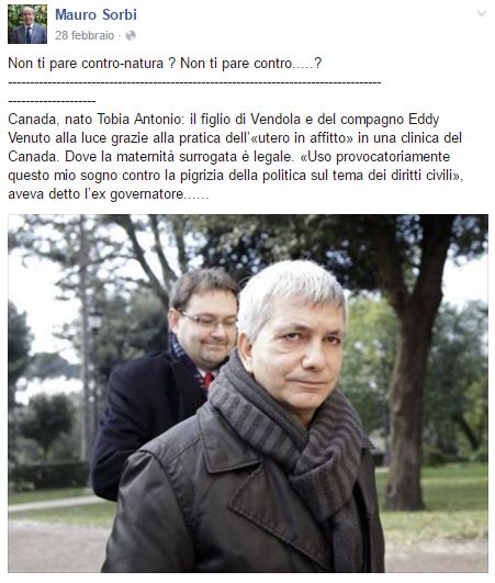 Nel post, accompagnato da una foto del leader di Sel Vendola, Sorbi si chiedeva “Non ti pare contro-natura?“. Nei commenti, lo stesso ex consigliere provinciale sosteneva poi che l’utero in affitto “rimane e sarà sempre una bestialità“. A domanda, Sorbi chiarisce che non ci sono state pressioni per le sue dimissioni, ma che sarebbe stato solo un amico dell’Udc ad avvertirlo su possibili problemi al riguardo. Colpisce perà l”assonanza col caso che ha riguardato solo poche settimana fa Paolo De Fraia: inserito nella lista Pd dopo essere stato ”sponsorizzato” presso il sindaco dall’associazione “Per un”amicizia civile” (si impegnò a questo riguardo l’ex ministro Dc Gian Carlo Tesini), De Fraia fu costretto al passo indietro per le sue posizioni anti-gender.