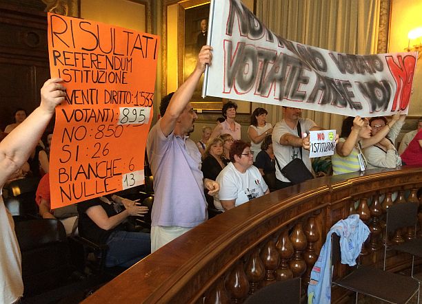 Come annunciato, il gruppo Sel-Frascaroli si è astenuto e non ha votato contro, come invece hanno fatto sia il Movimento 5 stelle che la maggior parte del gruppo di Forza Italia e i centristi di Insieme per Bologna (Aldrovandi e Castaldini).