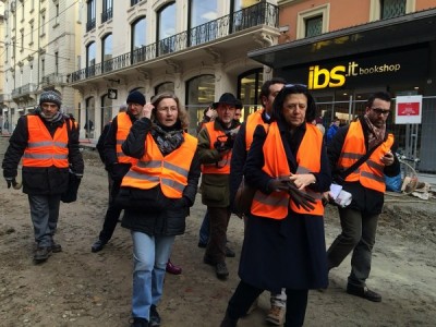 “Indossate il giubbetto arancione e non allontanatevi troppo” è stata la raccomandazione dell’ingegner Monzali ai giornalisti. “Questo è un cantiere attivo” dice il direttore dei lavori mentre con un fischio ferma una macchina operatrice intenta a spostare una bancale con i basoli. A poca distanza, una coppia di archeologi di Phoenix sta scavando una fossa di forma quadrata. Si tratta di una zona di scarico di materiale di scarto, racconta Marco Palmieri. “Abbiamo trovato ossa animali e altro materiale di scarto” racconta togliendo la testa di una grande osso da un sacchetto di nylon trasparente. Il suo collega Flavio è chinato nella buca e con il solo ausilio di una piccola cazzuola sposta delicatamente la terra scura. “Cerchiamo materiali datanti (oggetti che possano consentire una datazione dello strato in cui si trovano)” spiega Palmieri che precisa si tratta di un semplice “saggio esplorativo” eseguito su indicazione della Soprintendenza.