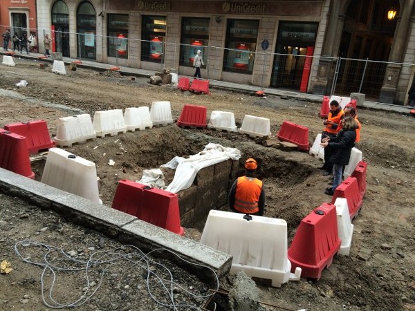 Tolti i basoli, rimosse le povere macerie delle casupole medievali abbattute attorno al 1910 e utilizzate come fondo per la costruzione della via, le ruspe di coop Costruzioni si sono messe a scavare sotto l’occhio vigile degli archeologi (in cantiere grazie ad un accordo tra Tper e Soprintendenza). E così, poco a poco, sono tornate alla luce mura di mattoni, blocchi di pietra più grandi, vecchie condotte di metallo e scanafossi di pietra. Secoli di urbanistica bolognese, un libro aperto per archeologi e studiosi. Un libro noto: nulla di sorprendente, spiega Curina, quasi tutto previsto. Nonostante questo, sempre affascinante e utile per aggiungere conoscenza alla conoscenza. E’ per questo che, dopo i rilevamenti degli archeologi, la catalogazione dei reperti e una dettagliata documentazione fotografica, i ritrovamenti verranno nuovamente interrati.