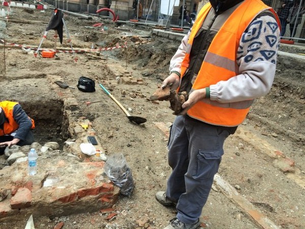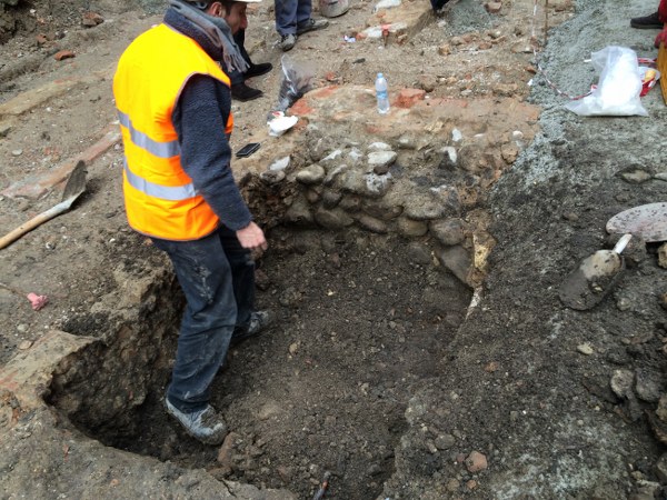 “Indossate il giubbetto arancione e non allontanatevi troppo” è stata la raccomandazione dell’ingegner Monzali ai giornalisti. “Questo è un cantiere attivo” dice il direttore dei lavori mentre con un fischio ferma una macchina operatrice intenta a spostare una bancale con i basoli. A poca distanza, una coppia di archeologi di Phoenix sta scavando una fossa di forma quadrata. Si tratta di una zona di scarico di materiale di scarto, racconta Marco Palmieri. “Abbiamo trovato ossa animali e altro materiale di scarto” racconta togliendo la testa di una grande osso da un sacchetto di nylon trasparente. Il suo collega Flavio è chinato nella buca e con il solo ausilio di una piccola cazzuola sposta delicatamente la terra scura. “Cerchiamo materiali datanti (oggetti che possano consentire una datazione dello strato in cui si trovano)” spiega Palmieri che precisa si tratta di un semplice “saggio esplorativo” eseguito su indicazione della Soprintendenza.