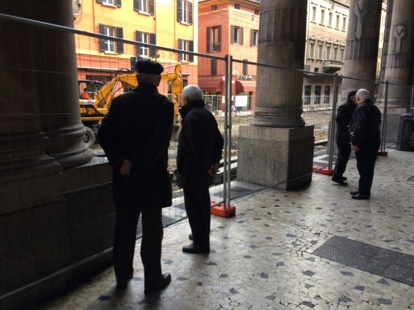 “Su via Ugo Bassi la situazione dovrebbe essere più semplice” spiega Curina, secondo cui in questo lato della città il piano di calpestio romano, su cui appoggiano appunto le mura di selenite, è ad un livello più basso rispetto a quello di via Rizzoli. Per questo le previsioni danno per assai remota la possibilità di vedere affiorare, all’altezza del voltone di Palazzo d’Accursio che si affaccia su via Ugo Bassi, un tratto delle antiche mura di gesso.