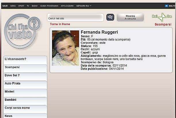 Bologna, 7 nov. – Fernanda Ruggeri ha 85 anni, vive in via Santa Cristina, zona Saragozza, si è allontanata da casa domenica scorsa per andare a messa. In chiesa però non è mai arrivata e da quel momento nessuno ha più notizie di lei. Anche la trasmissione “Chi l’ha visto?” si è occupata del caso.
