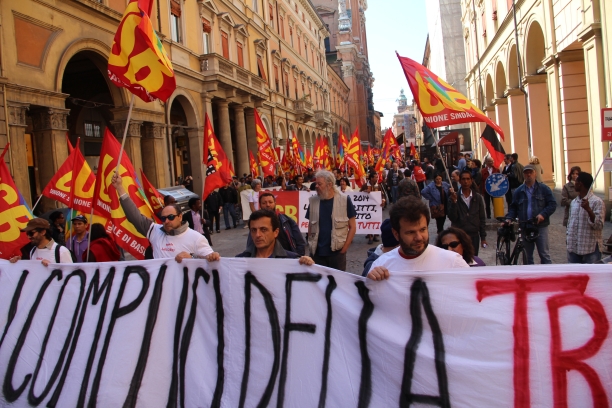 Bologna, 1 mag. – Centinaia di persone sfilano nel corteo del sindacato di base Usb. “Siamo in piazza a testa alta contro Renzi, il suo jobs act che creerà solo precarietà e le politiche di austerità della Troika e della Bce”, dicono i sindacalisti al megafono. Dietro di loro striscioni per il diritto alla casa, per la scuola pubblica e contro la precarietà. E’ arrivati di fronte al McDonald’s di via Indipendenza, rimasto aperto nonostante il Primo Maggio, che parte l’azione di protesta. Alcuni manifestanti vestiti di nero si avvicinano alle vetrine, accendono dei fumogeni e infine lanciano sul pavimento un sacco pieno di vermi. “Il primo maggio non si lavora, si festeggia il lavoro e i lavoratori, il primo maggio è un giorno di lotta”.