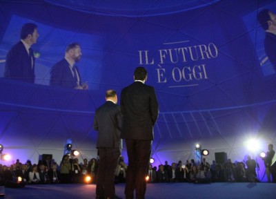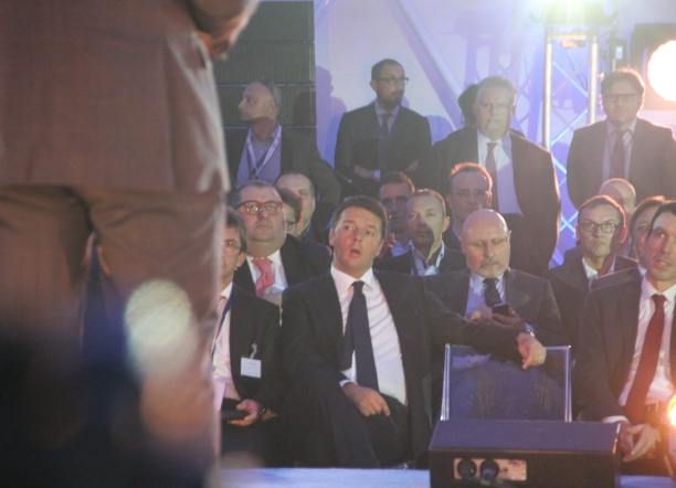 Il suo discorso, 7 minuti in tutto in uno stile molto americano, Renzi lo fa su un palco dentro un’enorme struttura a semisfera montata per l’occasione a Zola Predosa, nelle vicinanze di Crespellano. All’interno vengono proiettati filmati a 360 gradi, con effetti sonori e visivi cinematografici. E’ il futuro che si immagina Philip Morris, che di mestiere vende sigarette in tutto il mondo, ma è anche un format che al premier non dispiace mentre di fronte a una platea di autorità locali e giornalisti dispensa ottimismo e buona volontà. Fuori, lontano dalle telecamere, una decina di vendoliani prova a contestare il jobs act, ma sono così pochi da essere irrilevanti. Ancora più lontano la Fiom, che pensando alla posa della prima pietra si presenta dove sarà costruita la futura fabbrica della Philip Morris, e cioè a Crespellano. Non si sa se per scelta consapevole o per errore. Renzi invece è a Zola, a qualche chilometro di distanza, e invece di posarla la prima pietra la autografa sul palco di fronte alle telecamere.