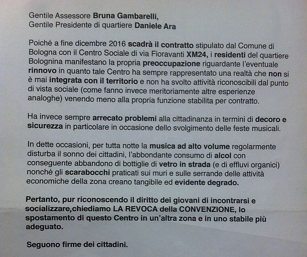 Bologna, 15 dic. – Dopo i favorevoli arrivano i contrari. Se a fine novembre avevano preso posizione a favore di Xm24 il comitato Concibò e la scuola di musica Ivan Illich, questa volta a schierarsi – ma dall’altra parte della barricata – è un gruppo di cittadini che chiede lo spostamento del centro sociale autogestito. “Siamo abbondantemente oltre quota 500 firme raccolte“, spiega un abitante della zona che ha firmato e che promuove l’iniziativa. La raccolta firme si è messa in moto senza banchetti, “col semplice passaparola”, e arriva quando mancano pochi giorni alla scadenza della convenzione tra Xm e il Comune di Bologna. Una raccolta firma che mostra come il tema Xm24 non faccia solo discutere, ma divida il quartiere.