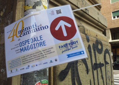 In alcuni incroci stradali di Bologna sono comparsi cartelli che indicano per quanti minuti bisogna camminare per arrivare nei punti più significativi della città -