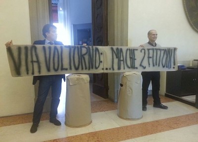 Protesta di Forza Italia in Comune, a Bologna, contro le barriere che impediscono il passaggio delle auto in via Volturno. Protagonisti i consiglieri Carella e Tomassini -
