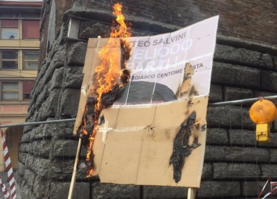 Centro blindato per la presenza del leader leghista oggi pomeriggio. Attivisti di Hobo bruciano gigantografia del suo libro. E lui rilancia per il 2 giugno -
