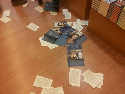 Il collettivo chiude la sua giornata di protesta entrando in libreria e strappando le pagine dell'ultimo libro del leader della Lega Nord