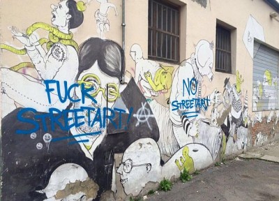 "Fuck street art" e "No street art". Non potevano essere più esplicite le scritte apparse sopra un murales di Blu, artista di strada italiano conosciuto a livello internazionale -