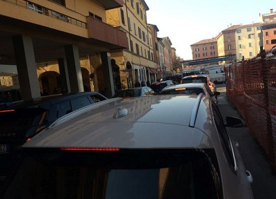 In via Alessandrini decine di mezzi imbottigliati, e i conducenti si sfogano a colpi di clacson. Martedì 13 sciopero di quattro ore dei conducenti dei bus Tper