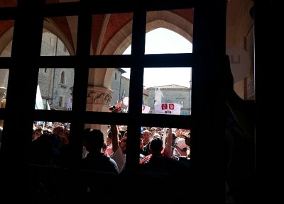Più volte la folla tenta, senza successo, di sfondare il cordone di protezione ed entrare nel tempio della politica sammarinese protetto dagli agenti di Guardia di Rocca e Gendarmeria in tenuta... -