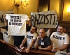 Esercenti, pizzaioli e baristi arrivati in aula durante la riunione del consiglio indossando magliette con scritto: "Questo è un abuso di potere" e mostrando cartelli con scritto "uguaglianza". ... -