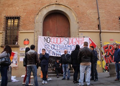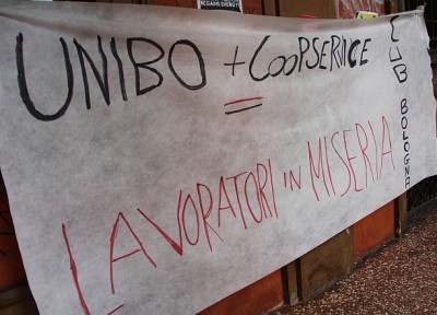 I lavoratori Coopservice dell'Università di Bologna e i collettivi universitari Hobo e Cua riprendono le proteste in via Zamboni. Picchetti lungo tutta la via -
