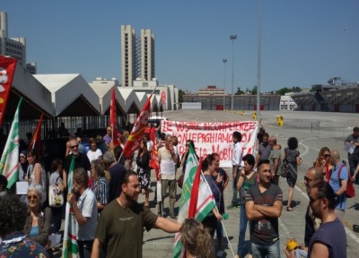 Protesta dei lavoratori della fiera contro i 123 licenziamenti annunciati
